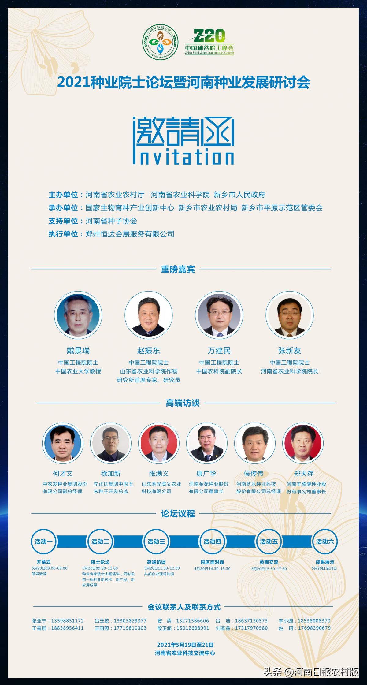 (二)院士论坛。定于5月20日9:00在河南省农业科技交流中心报告厅举行,邀请戴景瑞院士、赵振东院士、万建民院士和张新友院士做种业发展主题报告。