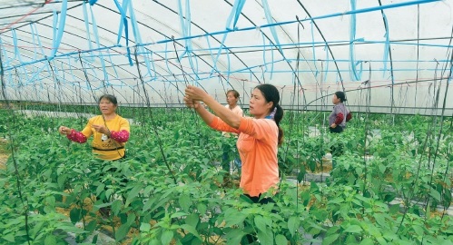 贵州省锦屏县采取“党支部+龙头企业+合作社+农户”的生产模式,从外省引进“金玉大青椒”良种,鼓励农民发展辣椒种植产业。“金玉大青椒”属早熟品种,果长20-25厘米,果大4.5-5.5厘米,果肉厚0.4厘米,单果重150-180克。丰产性能出类拔萃,适应范围广。目前,“金玉大青椒”已在锦屏县大面积推广,成为当地群众增收致富的主打产业。图为近日,新化乡新化所村大棚蔬菜基地,合作社社员们正在给“金玉大青椒”绑枝。