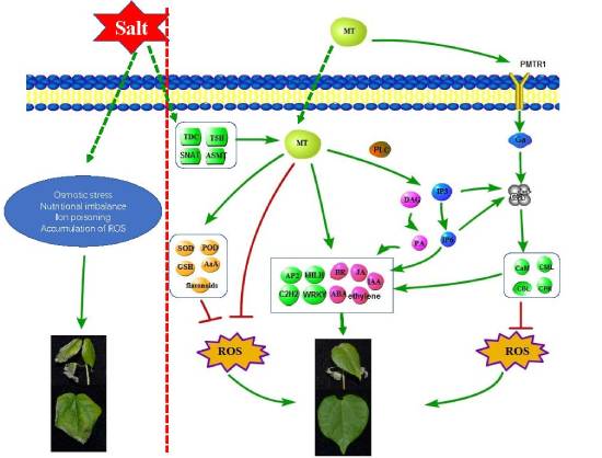 近日,中国农业科学院棉花研究所品种资源研究室通过沉默陆地棉褪黑素合成基因和外源褪黑素的应用,研究了褪黑素在棉花耐盐性中的作用,揭示了褪黑素增强棉花耐盐性的分子机制,为理解褪黑素提高棉花抗逆性的作用提供了新的依据。相关研究结果发表在国际学术期刊《植物科学前沿(Frontiers in Plant Science)》上。