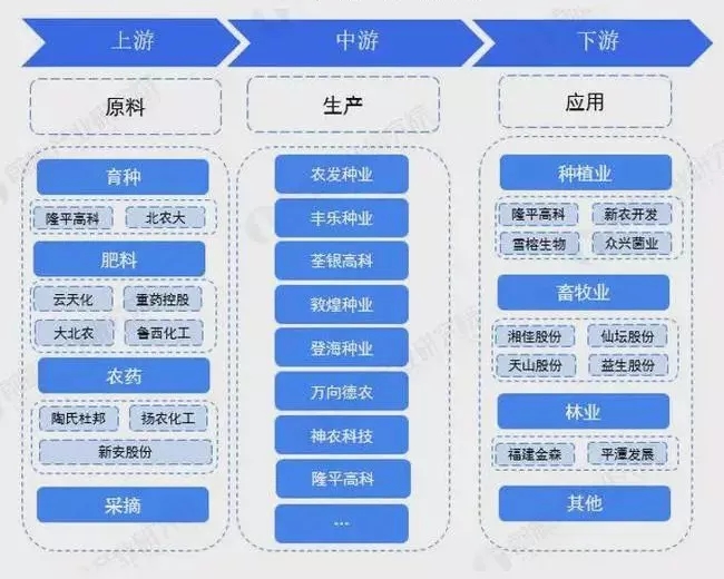 要说种业,我们可以先简要介绍一下农业。农业生产产业链的上游是原料,包括种子、化肥、农药、农业机械等;中游主要是粮食种植和土地承包等播种、耕耘、收获的过程;下游则是农作物的生产加工环节。