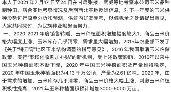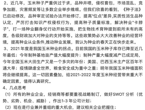 (3)玉米种业下年度将是“大变革”时期,整个产业链出现不适应,产业链中的一批企业会走向“死亡”、“休克”、“重组”,矛盾等纠纷大幅度上升,同时会有企业得以快速发展,所有行业人要做好准备;