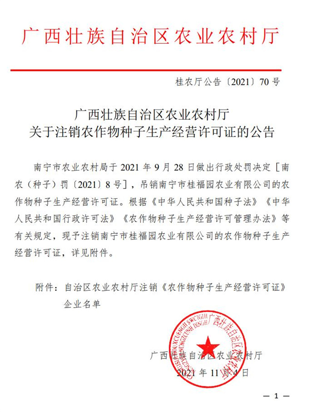 广西壮族自治区农业农村厅关于注销农作物种子生产经营许可证的公告【2021】70号