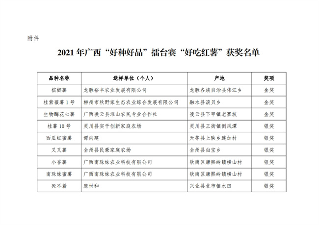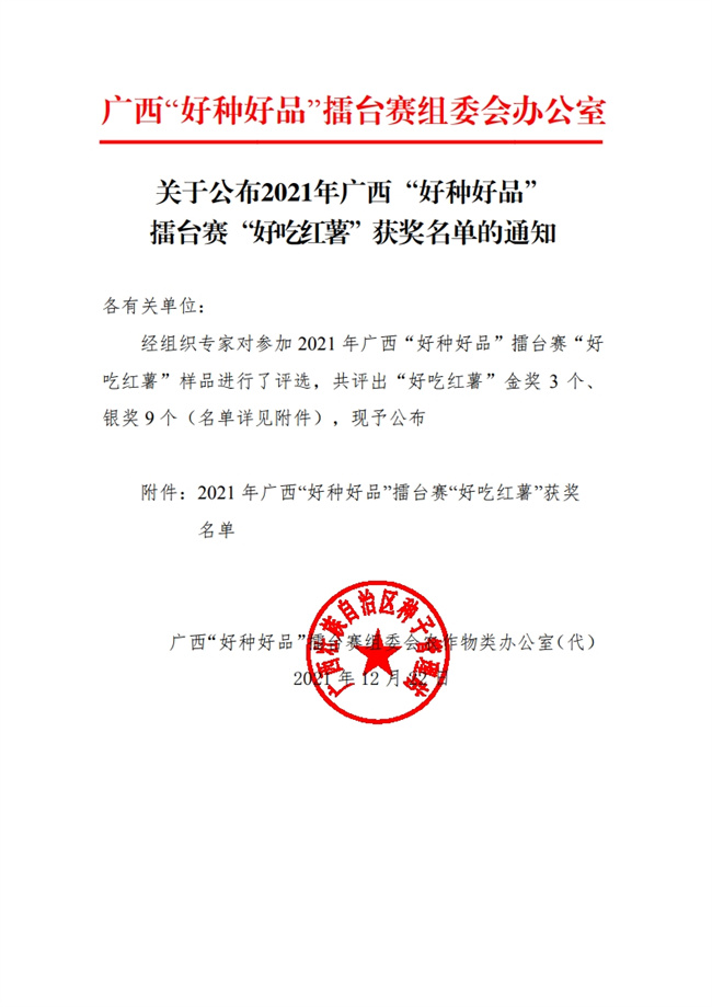 为推进我区品种培优、品质提升和质量兴种、品牌强种,我站组织专家对参加2021年广西“好种好品”擂台赛“好吃红薯”35样品进行了评选,共评出“好吃红薯”金奖3个、银奖9个。12月24日,我站召开“好吃红薯”,对获奖品种进行集中品鉴。自治区农业农村厅党组成员、副厅长文信连出席会议,并为获奖品种颁发牌匾。