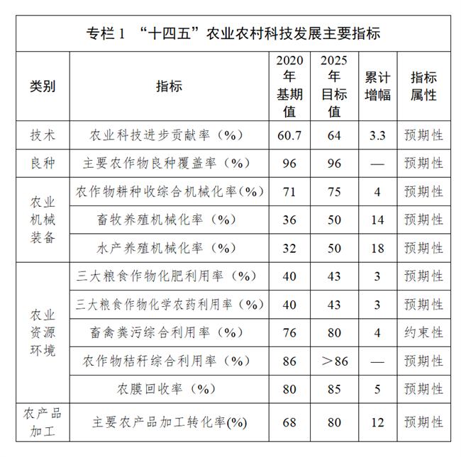 到2025年,力争突破一批受制于人的“卡脖子”技术和短板技术,农业领域原始创新能力大幅提升,农业科技整体实力稳居世界第一方阵,生物育种、农业5G应用、动物疫苗等领域居世界领先水平。农业土地产出率、劳动生产率、资源利用率等进一步提高,生物种业、耕地保育、智慧农业、农机装备、绿色投入品等领域产业竞争力显著提升,农业科技进步贡献率达到64%。新时代中国特色农业农村科技创新体系基本完善,企业创新主体地位快速提升,农业科技国际交流与合作不断深化,农业农村科技创新、推广服务更加高效,高素质农民队伍更加壮大,科技支撑乡村振兴的能力显著提升,形成“职责聚焦、分工科学、导向明确、科产融合”的新格局。