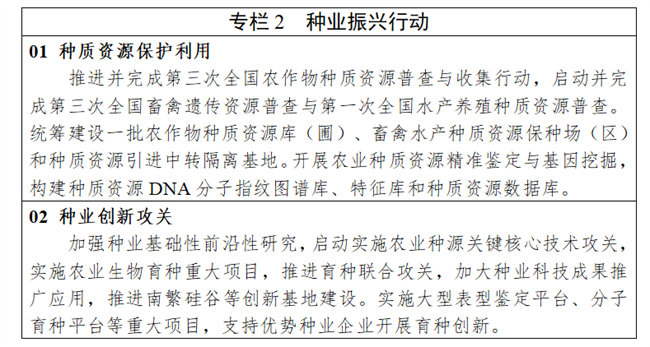 加强种质资源创新与利用,开展生物育种技术体系创新,培育突破性新品种,实现种源核心技术与战略品种国产化,推进种业振兴。