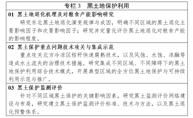 黑土地保护。探明黑土地质量演变规律及退化区地力提升与高产区土壤保育机制。重点攻关秸秆快速腐熟、有机质功能提升、固碳减排、粮豆轮作与休耕、风蚀监测与水土流失治理、保护性耕作与耕层构建、旱作节水等关键技术。集成示范推广保护性耕作、秸秆过腹还田、炭化还田等保护与利用技术模式及配套管理技术模式。