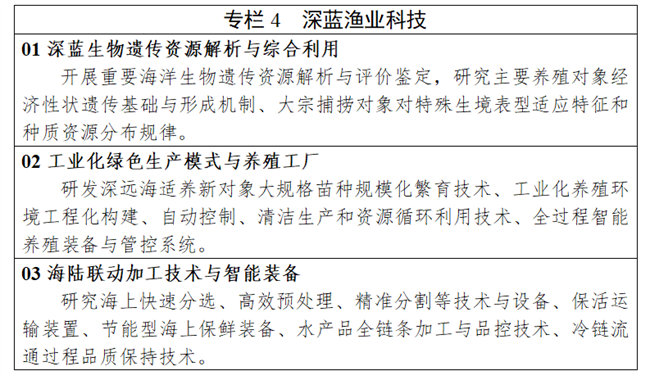 渔业提质增效生产。研究陆基工厂化养殖、海淡水池塘养殖、深远海养殖、稻渔综合种养、大水面生态渔业、盐碱水养殖等水产绿色健康养殖模式。开展水产养殖苗种繁育、遗传育种改良技术研究,研发优质、高效、多抗、安全的水产新品种。研究水产养殖饲料高效利用技术,推进配合饲料替代幼杂鱼。研发推广高效特异性水产养殖用疫苗和病害控制关键技术。开展深海、大洋渔业资源高品质捕捞、捕捞机械化、极地渔业资源可持续开发等关键技术和装备研发。