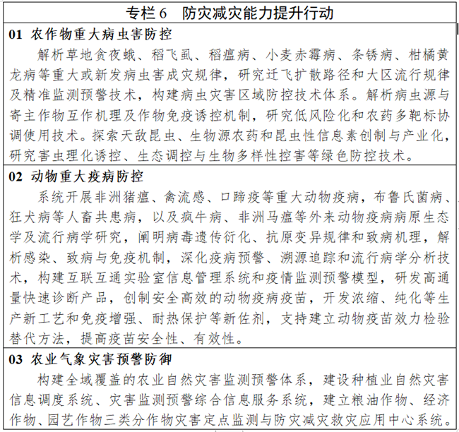 全链条抓好抓实农业领域生物安全重点工作。开展防范化解农业重大风险的前瞻性、储备性、应急性关键技术研发与产品创制,提升农业抗灾减灾能力和产业安全保障能力。