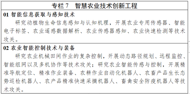 智慧农业技术。研究动植物生命信息感知与调控、高时空遥感测报与传感智能控制、动植物表型组高通量获取与智能解析、农业生态环境监测等技术。研发智能育种技术和自动化播种、考种技术、耕地质量动态监测技术、新生物成像技术、机器视觉和数字化交互技术、蔬菜规模化生产人机智能协调技术、农业专用机器人等。研发应用小麦、水稻、玉米机械收获过程自动测产技术。加快互联网+、物联网+、大数据、人工智能、区块链等与农业结合技术研发与应用。