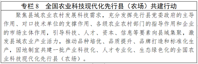 开展全国农业科技现代化先行县(农场)共建。以各级农业科研教学推广单位为技术依托,充分发挥涉农科技型企业和新型经营主体作用,立足地方资源禀赋和比较优势,聚焦县域主导产业,围绕产业链各环节技术需求,通过共建平台、联合攻关、协同推广和品牌创建等方式,实现成果和服务精准供给,推动县域优势特色产业转型升级和提质增效,因地制宜共建一批产业科技化、人才专业化、生态绿色化的农业科技现代化先行县(农场)。