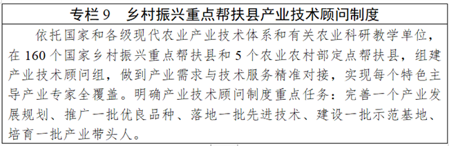 深入推进农业科技帮扶重点地区产业发展。在乡村振兴重点帮扶县实施产业技术顾问制度。坚持以做优做强特色产业为核心,协助脱贫地区选准选精产业,梳理技术需求,完善产业发展规划。依托现代农业产业技术体系,为160个国家乡村振兴重点帮扶县和5个农业农村部定点帮扶县,组建产业技术顾问组,选派科技特派团,做到产业需求与技术服务精准对接,实现每个特色主导产业专家全覆盖。围绕新疆和西藏特色发展具体需求,组建棉花、青稞等农牧业全产业链技术指导专家组。通过推广适宜品种、加快先进实用技术应用,推动重点地区农业特色产业发展提档升级。
