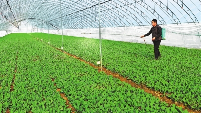 柘城县起台农场广江种植农民专业合作社蔬菜大棚内,工人正在管理蔬菜。 张子斌 摄