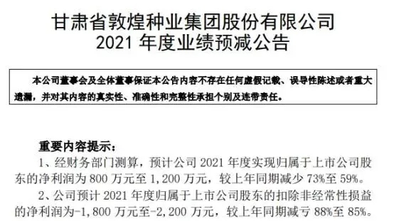 1月26日,敦煌种业发布2021年年度业绩预告:预计公司2021年度实现归属于上市公司股东的净利润为800万元至1,200万元,较上年同期减少59%至73%。