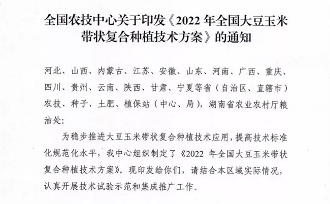 2022年,农业农村部拟在全国16个省(市、区)组织推广应用玉米大豆带状复合种植面积1550万亩。《2022年全国大豆玉米带状复合种植技术方案》强调,要坚持稳粮与增豆并重,通过大面积推广应用该项技术,力争玉米单产与清种基本相当,大豆平均亩产达到100公斤左右。