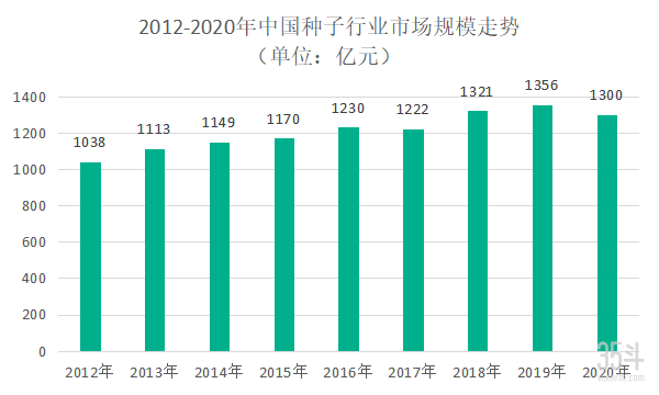 自种业进入市场化发展以来,我国种子行业的市场容量便不断扩大。2012年国内种子行业市场规模1038亿元,到2020年种子市场规模达到了1300亿元。