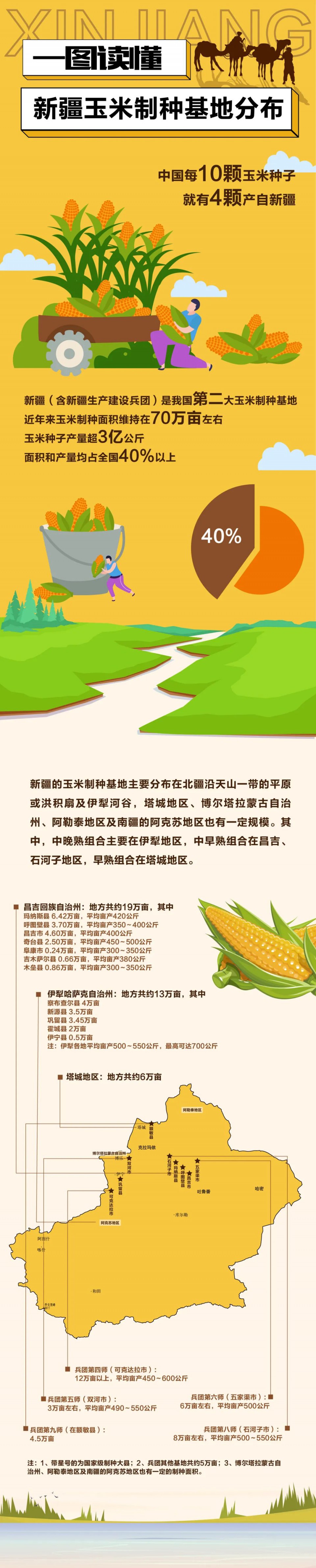 近年来,新疆(含新疆生产建设兵团)玉米制种面积维持在70万亩左右,年产玉米种子超3亿公斤,面积和产量均占全国40%以上,是我国第二大玉米制种基地。