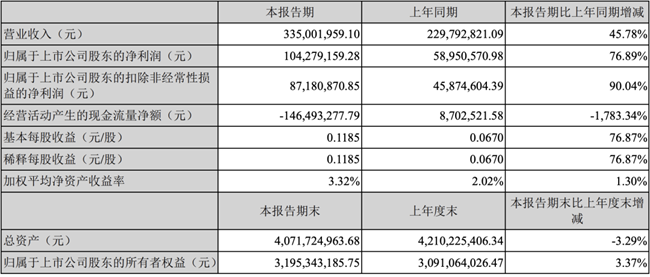 报告期内公司实现营业收入335,001,959.10元,同比增长45.78%;主要原因是公司销售量较上年同期增长影响所致。归属于上市公司股东的净利润104,279,159.28元,同比增长76.89%,主要原因是公司盈利能力提升所致。