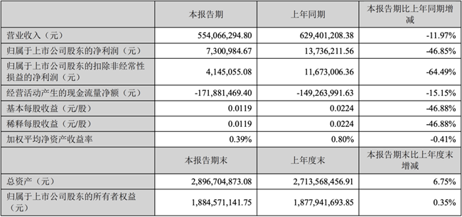 报告期内公司实现营业收入206,266,189.88元,同比下滑4.88%;主要系报告期销售减少所致。归属于上市公司股东的净利润8,002,070.73元,同比下滑50.55%,主要系报告期实现的净利润减少所致。