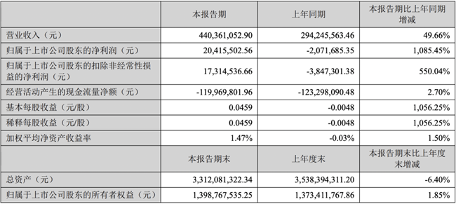 5月1日,荃银高科(300087)发布2022年第一季度报告,报告期内公司实现营业收入440,361,052.90元,同比增加49.66%;归属于上市公司股东的净利润20,415,502.56元,同比增加1,085.45%。