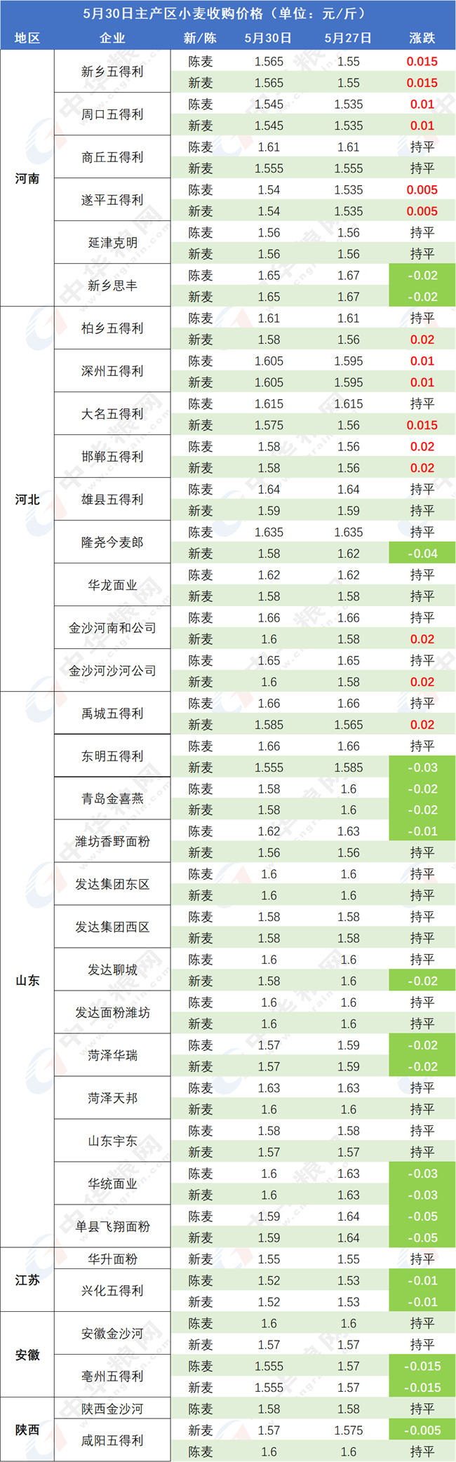 我们昨天刚提到政策性粮陆续开库 小麦即将动涨。。。今天小麦就应景上涨,五得利大范围上调收购价格1.5-2分!(见下图)不过目前市场行情还不稳,新麦上量加大,参考当地政策性粮轮入价格,部分贸易粮开始建仓。需要提醒的是今年一定注意质量把控,尤其是新麦水分问题。