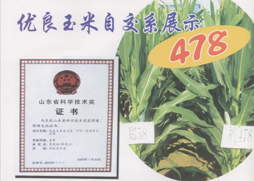 478玉米自交系是山东登海种业股份有限公司(原莱州市农业科学院)育成的优良自交系。478自交系综合性状好,配合力高,是我国超高产玉米的骨干自交系,丰富了我国的玉米种质资源。荣获2005年度山东省科学技术奖一等奖。
