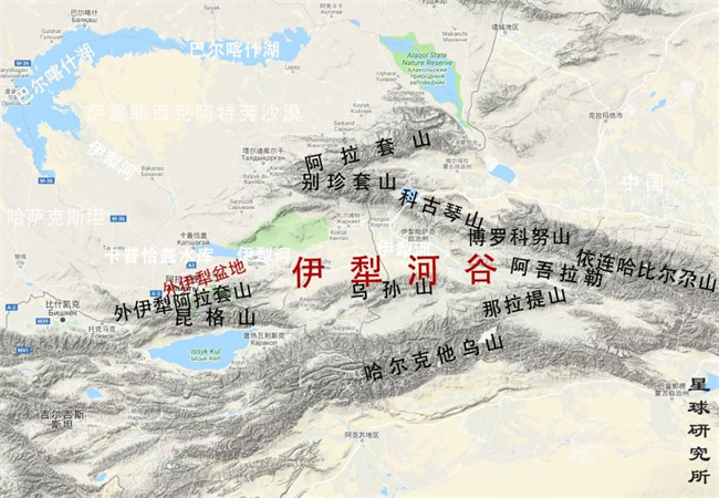 伊犁河流域地形图,伊犁河自东向西贯流,最终注入今哈萨克斯坦境内的巴尔喀什湖;因为有7条河流汇入巴尔喀什湖,所以国外亦将外伊犁及其外延称为“七河之地”。