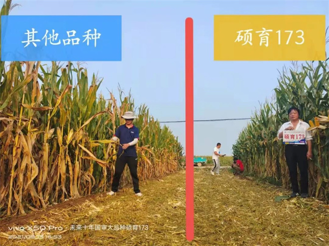 高抗倒伏。硕育173,株高250厘米左右,穗位90厘米左右比例适宜。株型紧凑,茎秆粗壮,弹性好,气生根发达,抓地牢,抗倒折能力强。自市场推广以来,经历多次大风和强降雨等自然灾害的情况下,无倒折情况发生,表现出优秀的抗倒折能力。