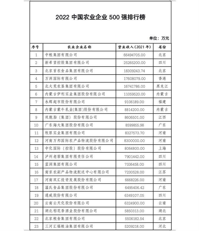 为全面、客观、系统展现我国农业企业发展情况,营造农业企业参与乡村振兴和建设农业强国的良好社会氛围,农民日报社发起2022中国农业企业500强评价活动,经信息汇集、严格审核、专家评议等程序,形成了《2022中国农业企业500强》(公示版)。