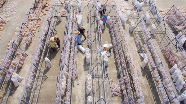 海南三亚某南繁育种基地内,育种工作者正在查看新收的杂交玉米种子。