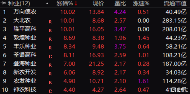 近期得益于利好整政策催化,种业概念股涨势良好。大北农、万向德农、隆平高科、敦煌种业等都有过涨停表现。