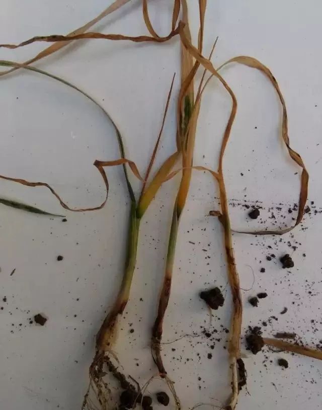 6.全蚀病。为典型的根部病害,幼苗期受害,初生根和根基部变黑褐色,存活病苗上部叶色变浅,基部叶片黄化,植株矮小,病株易自根基部处拔断。