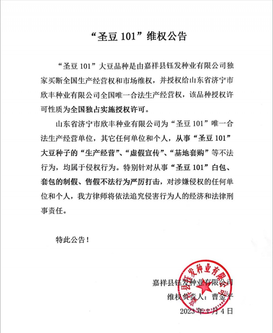 山东省济宁市欣丰种业有限公司为“圣豆101”唯一合法生产经营单位,其它任何单位和个人,从事“圣豆101”大豆种子的“生产经营”、“虚假宣传”、“基地套购”等不法行为,均属于侵权行为。特别针对从事“圣豆101”白包、套包的制假、售假不法行为严厉打击,对涉嫌侵权的任何单位和个人,我方律师将依法追究侵害行为人的经济和法律刑事责任。
