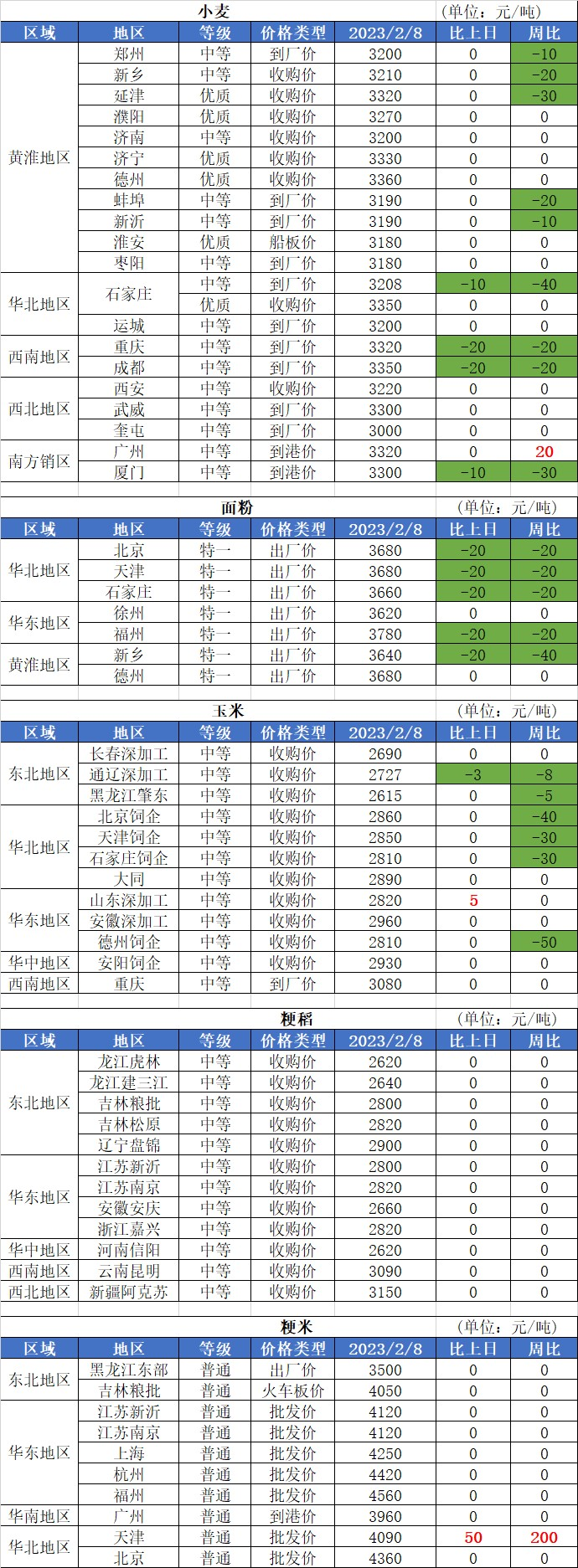 1、2月8日,最低收购价小麦拍卖共投放99630吨,全部成交。其中白小麦4042吨,成交均价3046元/吨;混合麦95588吨,成交均价2954元/吨。