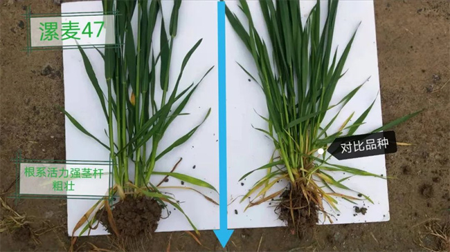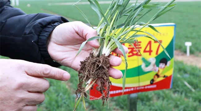 根系发达,毛细根多且入土深,吸水保水性好。2022年11月底到12月初的“断崖式”降温,部分小麦品种出现黄叶、干枯或死苗现象,有人认为这次冻害是由寒冷叠加干旱,以及秸秆还田不科学引起的,通过近期苗期走访,笔者认为,还与品种是否抗冻抗寒耐旱有关。为什么同一地块,同样的种植方式,不同品种表现差异却很大。漯麦47表现幼苗健壮,半匍匐、分蘖多,根系发达,叶片颜色浓绿,在这次“断崖式”降温中没受到任何影响。