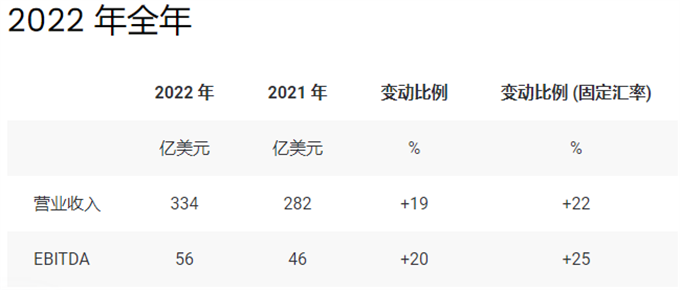 2022 年集团全年营业收入334亿美元,比上一年增加52亿美元,同比增长19%。所有业务部门均实现了两位数增长,这得益于全球市场对旨在促进产量增长和可持续耕作方法的产品和服务的高需求。全年EBITDA增长20%,达到56亿美元,创下历史新高。