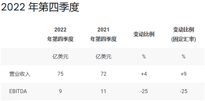 与2021年第四季度的强劲表现相比,2022年第四季度的EBITDA降至9亿美元,主要是全球宏观经济不确定性增加了成本和拨备。