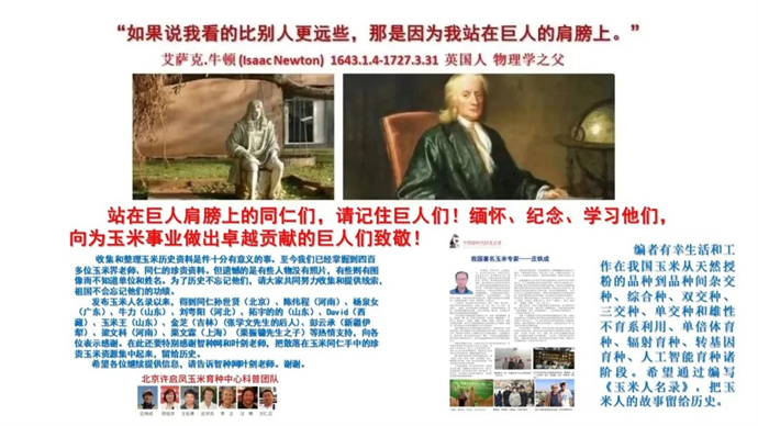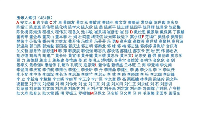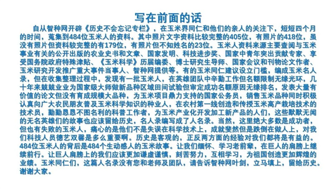 自从智种网开辟《历史不会忘记专栏》,在玉米界同仁和他们的亲人的关注下,短短四个月的时间,搜集到 484 位玉米人的资料。其中照片文字资料比较完整的 405 位,有照片的 418 位,虽没有照片但资料较完整的有 179 位,有照片但不知姓名的 23 位。玉米人资料来源主要查阅与玉米事业有关的公开出版的农业史书和文章、国家发明、科技进步奖、国家中青年突出贡献专家、享受国务院政府特殊津贴、《玉米科学》历届编委、博士研究生导师、国家会议和刊物论文作者、玉米研究开发推广重大事件当事人、智种网提供等。有的玉米同仁建议设立门槛,编成玉米名人录,但在收集整理过程中,发现有一批玉米人,在英雄团队中辛勤工作但名额限制无缘光环,几十年来兢兢业业为国家级大师做新品种区域田间试验但审定成功名额原因无缘排名,发表大量有价值的论文但没有育成规模大品种,为玉米项目鼎力支持的国家公务员,销售玉米品种同时积极认真向广大农民朋友普及玉米科学知识的种业人,在农村第一线创造和传授玉米高产栽培技术的技术员,勤勤恳恳不图名利的科普工作者,为玉米产业化开发加工新产品的人们,这些默默无闻的无名英雄们的故事也应该留给历史,名人录编写成了人名录。当然,这里绝大多数是成功者,但也有失败的玉米人,痛心的是他们不是失误在科学技术上,成就斐然但是跌倒在做人上,对我们科技人员德艺双馨是多么重要啊。历史是客观的,正反两方面的经验对我们都将是有益的。484 位玉米人的背后是 484 个生动感人的玉米故事。让我们缅怀、学习老前辈,在巨人的肩膀上继续前行。让巨人肩膀上的我们应该更加谦虚谨慎,刻苦努力,互相学习,为祖国创造更加辉煌的业绩。玉米同仁们,这篇人名录没有您和老师及团队,请告诉智种网,立马填上,留给历史。谢谢大家。