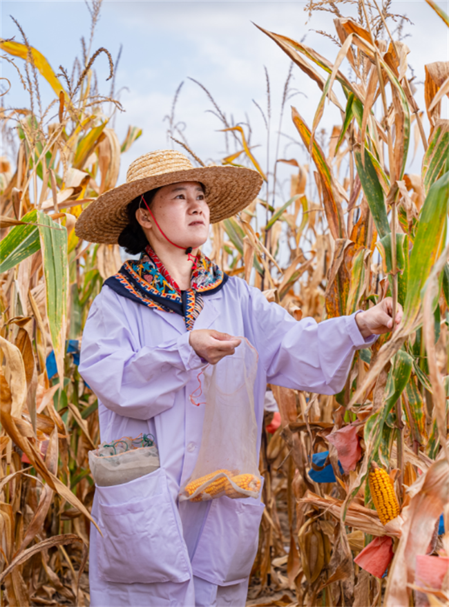 大北农丰度高科研究院副院长兼育种总监郑淑云正在田间收种。