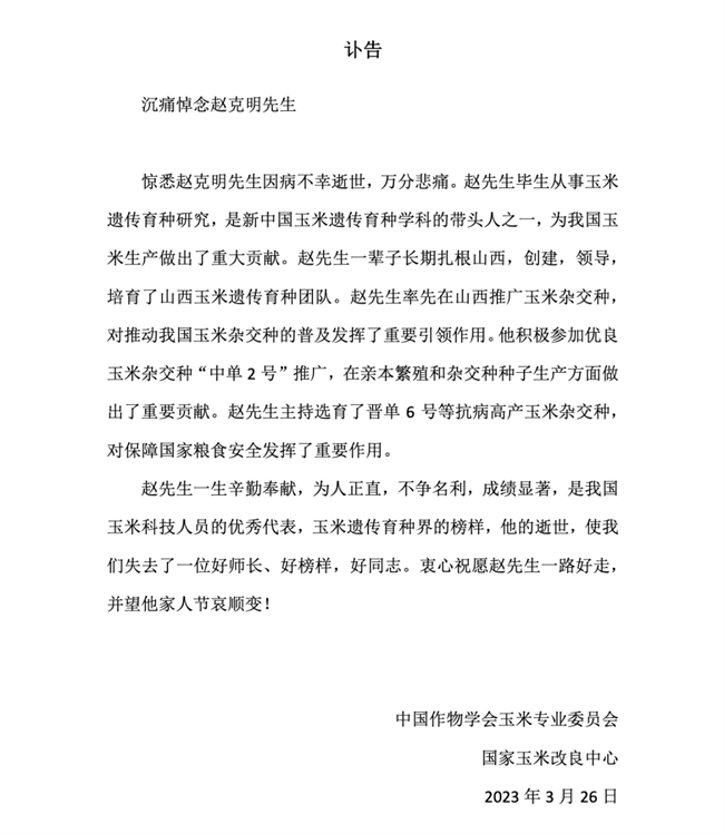3月26日上午,著名玉米育种专家、山西玉米遗传育种领军人物赵克明先生在太原仙逝,享年94岁。