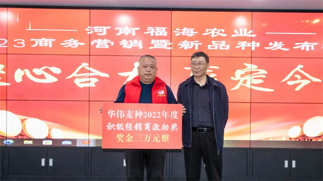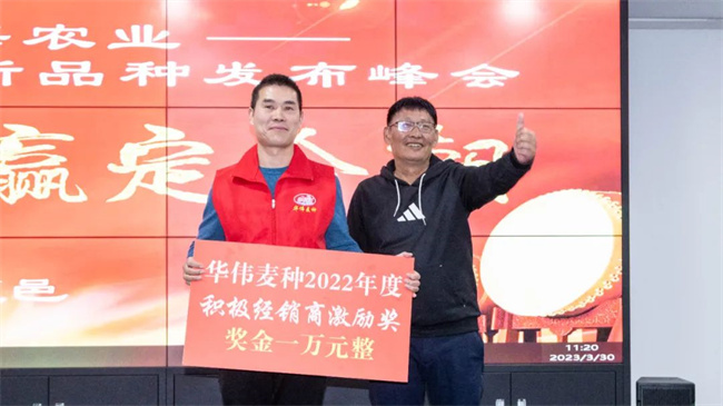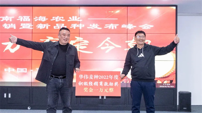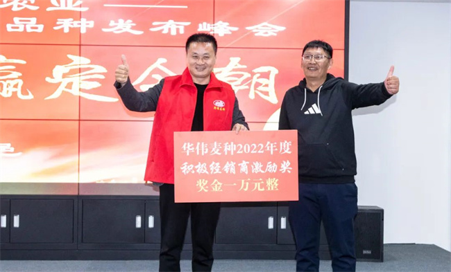 为了表彰先进,提高广大经销商推广华伟系列小麦品种的积极性,公司对在过去的一年里推广工作表现突出的优秀经销商奖(奖励现金6万元)、积极推广奖(奖励现金3万元)和激励奖(奖励现金1万元)三个奖项,各合作伙伴分别就推广经验和方法交流分享。