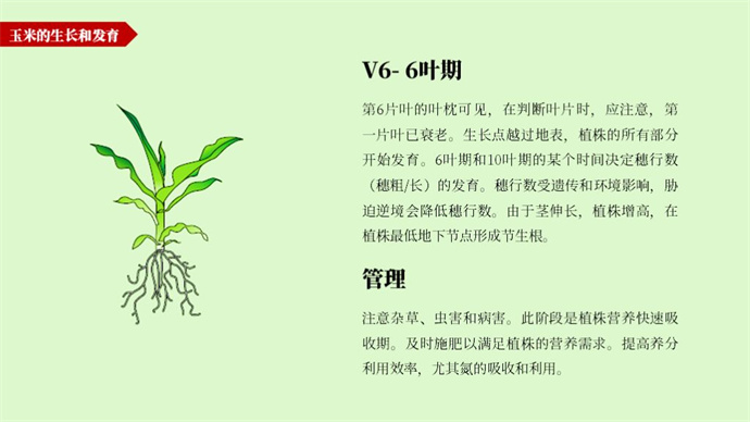 4) V6:第六叶完全展开,雄穗生长锥开始伸长,即玉米的拔节期。