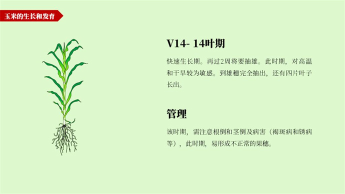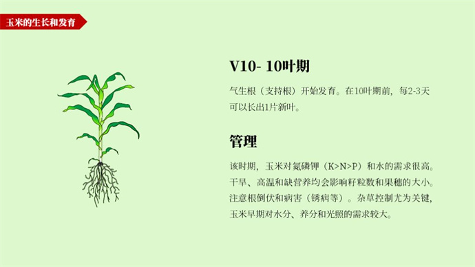 5) V12:第十二叶完全展开,雌穗进入小花分化期,即玉米的大喇叭口期。