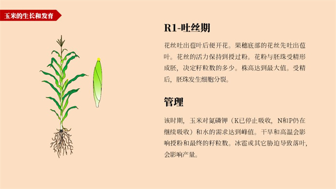7)R1:雌穗的花丝开始露出苞叶,即玉米的吐丝期。