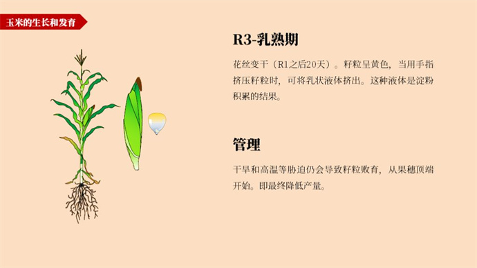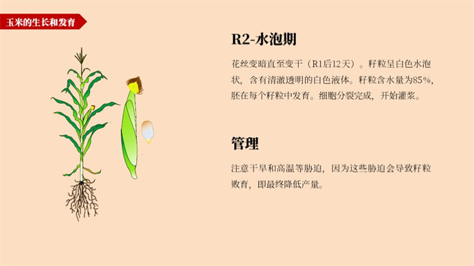 8)R2:果穗中部子粒体积基本建成,胚乳呈清浆状。即玉米的籽粒建成期。