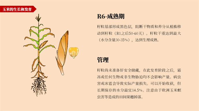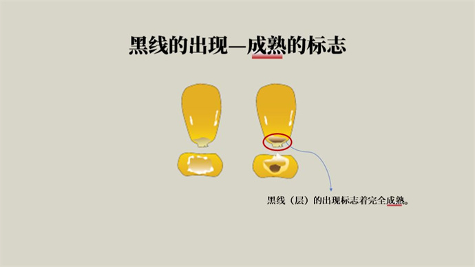 11)R6:植株子粒干硬,籽粒基部出现黑色层,乳线消失。即玉米的完熟期。