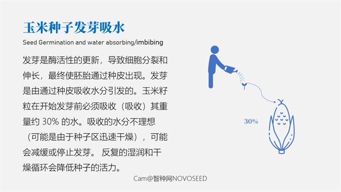 发芽是酶活性的更新,导致细胞分裂和伸长,最终使胚胎通过种皮出现。发芽是由通过种皮吸收水分引发的。玉米籽粒在开始发芽前必须吸收(吸收)其重量约 30% 的水。吸收的水分不理想(可能是由于种子区迅速干燥),可能会减缓或停止发芽。反复的湿润和干燥循环会降低种子的活力。