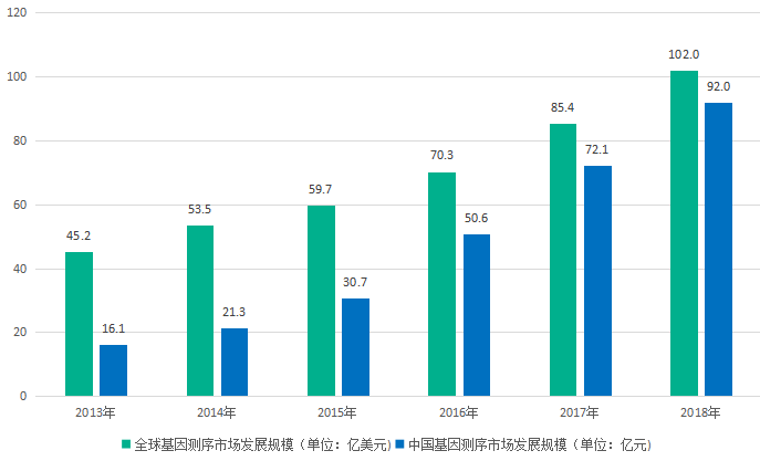 图:2013-2018年全球及中国基因测序市场发展规模