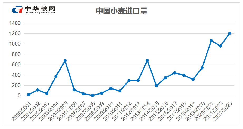 美国农业部发布的4月份供需报告称,2022/23年度中国将成为全球最大的小麦进口国,预计将进口1200万吨小麦,创下1995/96年度进口1250万吨小麦以来的最高进口规模。