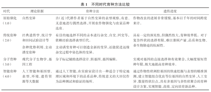 回顾发展历史,作物育种技术的变迁大致经历了3个阶段:原始驯化、传统育种和分子育种阶段,目前正阔步迈进智能育种时代。在此进程中,育种的预见性、准确性、效率越来越高(表1),实现“艺术→科学→智能”的革命性转变。分子育种包括分子标记、转基因、基因编辑3种类型。以QTL作图和RFLP、SSR、SNP等分子标记为基础,经历了标记开发、遗传图谱、功能和比较基因组连锁分析及基因组测序等不同发展时期。基本原理是利用与目标基因紧密连锁或表现共分离的分子标记进行单基因选择、多基因聚合以及全基因组选择,从而减少连锁累赘,获得目标个体。转基因技术打破了物种界限,将具有目标性状的外源基因直接转入到受体生物中,并使之产生可预期的、定向的遗传改变。在北美地区,90%以上的玉米、大豆、棉花、甜菜和油菜是转基因品种;我国已有26个转基因玉米项目、6个转基因大豆项目获得转基因生物安全证书,即将进入商业化推广。基因编辑是对自身的基因进行精准修饰,不仅可以去除或减弱不利的性状基因,还可以增强众多有益基因。利用基因编辑技术,我国已培育出高产、优质、抗除草剂、抗病虫的水稻、小麦、玉米、油菜等基因编辑作物;未来还将培育出产量更高、更有营养,更耐受极端天气,更高肥效、药效的作物。