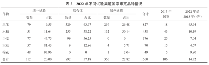 据农业农村部公告第557号、第625号,2022年五大主要农作物国家审定1560个品种,是2013年的14.72倍。其中玉米827个、水稻438个、小麦176个、大豆70个、棉花49个,分别是2013年的45.94、10.19、7.04、4.67、9.80倍。统一试验仍是棉花、大豆品种报审的主渠道,联合体试验报审的玉米、水稻、小麦品种占55%以上,统一试验报审的玉米、水稻品种仅占9.55%、11.64%(表2)。